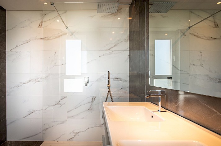 This apartment has 3 bedrooms in the primary bedroom, you will be able to add a queen size bed with has its own en-suite bathroom. The second bedroom, would manage a queen bed with the third bedroom to use as an office or you could add a single/king trundle bed to suit. There are 2 bathrooms with luxurious rain head walk-in showers. The primary en-suite has double sinks and heated towel bars