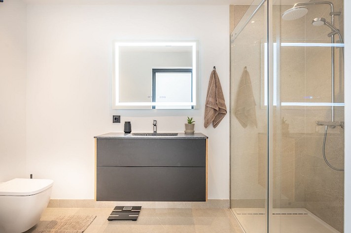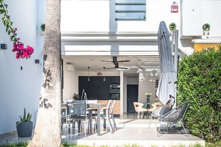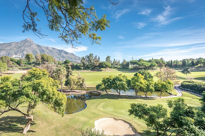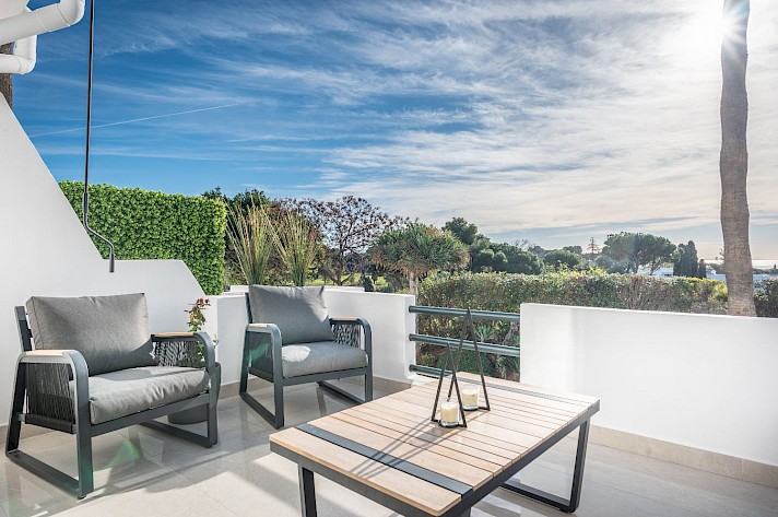 The property offers three double bedrooms, including a convenient ground-floor bedroom. Additionally, there is a fourth room that can be used as an office or storage space. The first floor features two terraces, each with breathtaking views—one overlooking the golf course towards the sparkling Mediterranean sea and the other offering serene views of the iconic La Concha mountain.